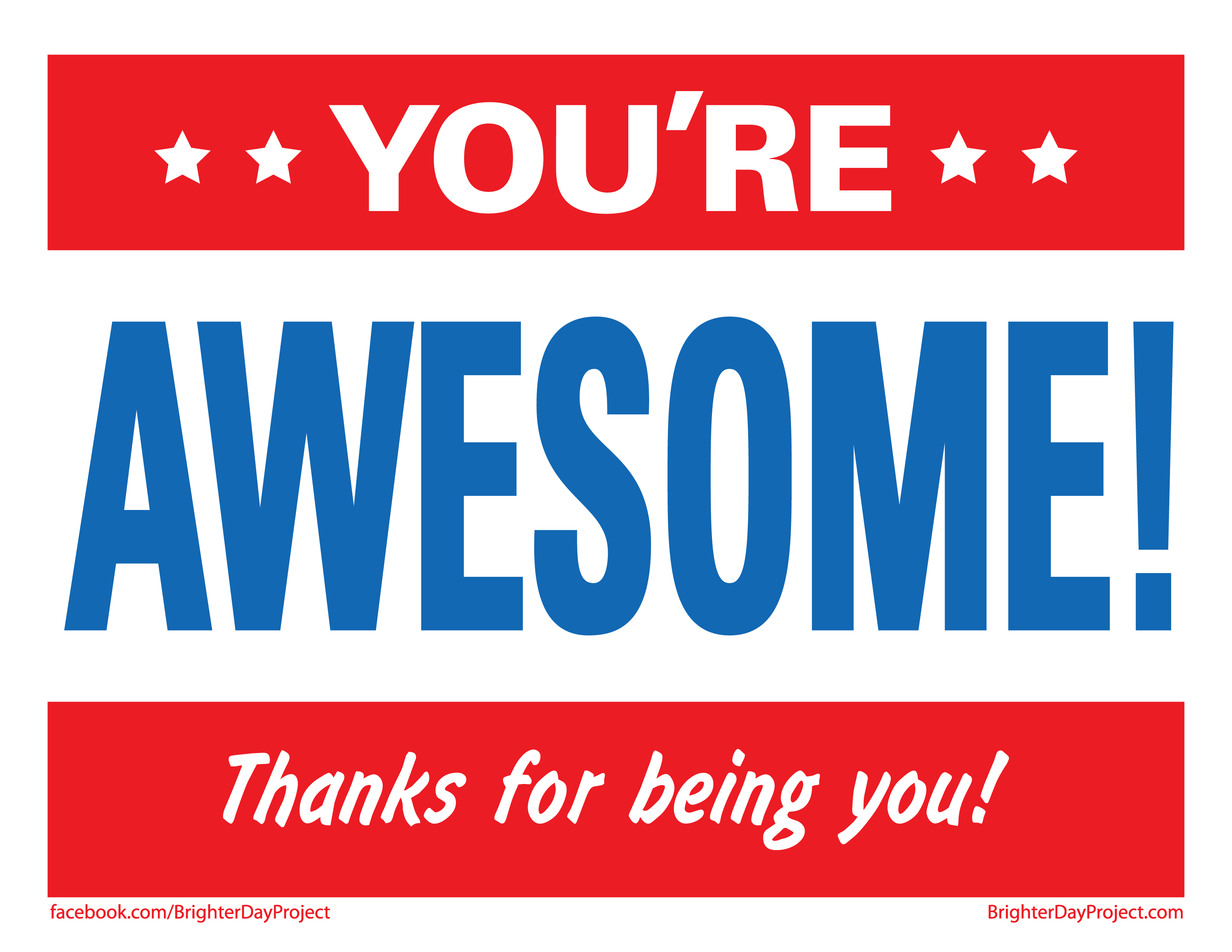 Do your part! We would like you to join in our effort to bring happiness to unexpected places. Use the links below to download the original “You’re Awesome” sign. Let us know what you do with yours.